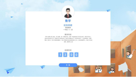 l 上課模式:上課時(shí)段,班牌自動(dòng)跳轉(zhuǎn)到上課模式,班牌展示上課時(shí)間、上課名稱(chēng)、授課教師及教學(xué)內(nèi)容。無(wú)操作情況下,上課模式顯示時(shí)長(zhǎng)為1分鐘。